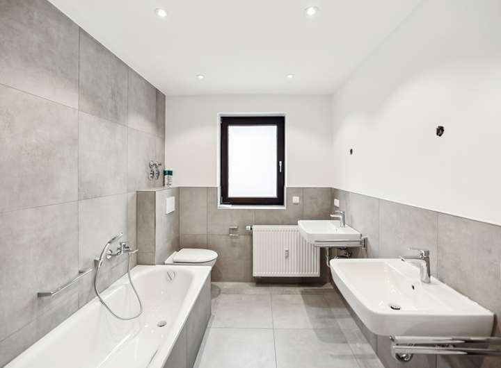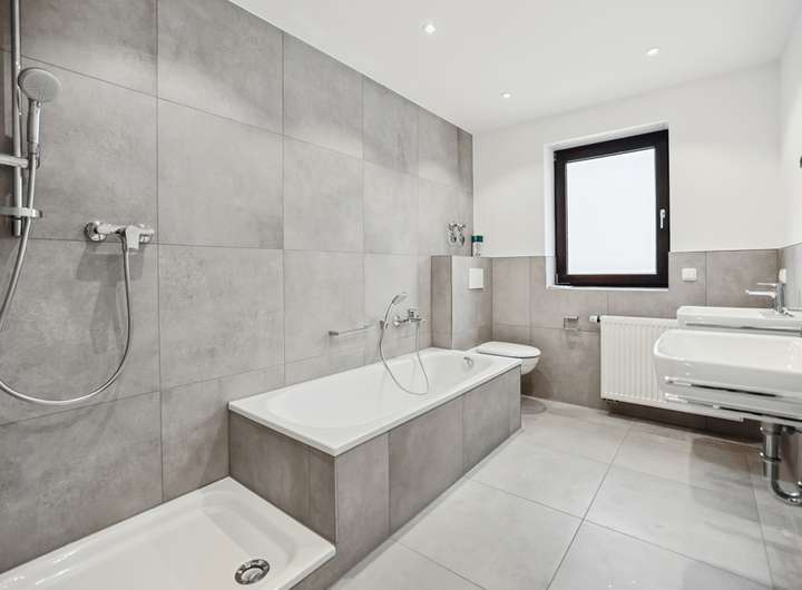 • stilvolles Badezimmer mit Badewanne, separater Dusche, Doppelwaschbecken, WC