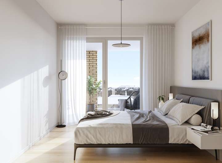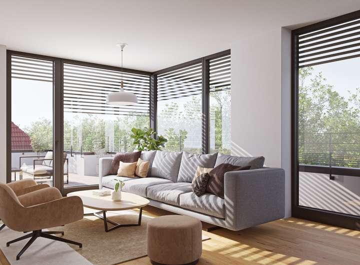 Großzügige, bodentiefe Fenster lassen viel Licht in alle Räume und sorgen für eine freundliche, helle Wohnstimmung. Abgerundet wird das stilvolle Wohnkonzept durch edle Eichenholzdielen in den Wohn- und Schlafräumen, die mit ihrer warmen Ausstrahlung ein behagliches Ambiente schaffen.