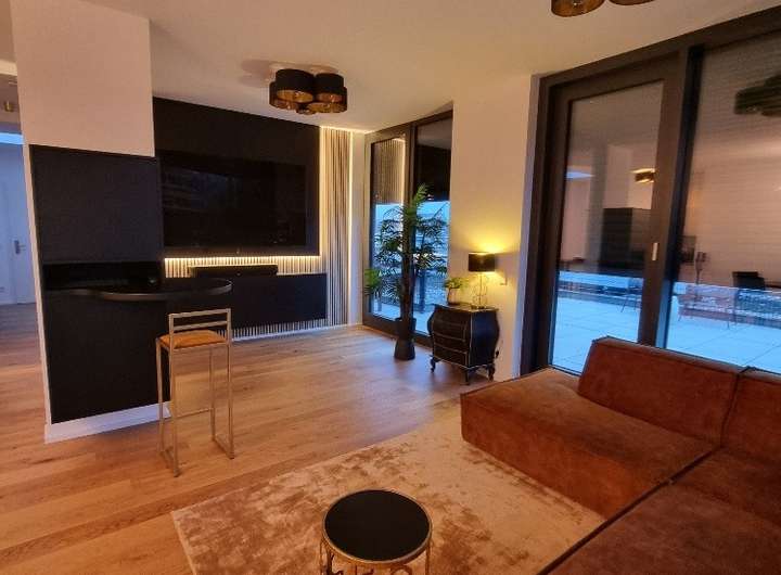 Der großzügig und offen gestaltete Wohn- und Essbereich bildet das Herzstück der Wohnung. Hier trifft moderne Architektur auf Wohnlichkeit: Die elegante Einbauküche mit Kochinsel lädt zum Kochen und Verweilen ein. Ob entspannter Abend oder geselliges Beisammensein – dieser Bereich schafft die perfekte Atmosphäre. Für ein stets angenehmes Raumklima sorgen Klimaanlagen im Wohnbereich sowie in beiden Schlafzimmern – besonders an warmen Sommertagen ein unschätzbarer Vorteil.