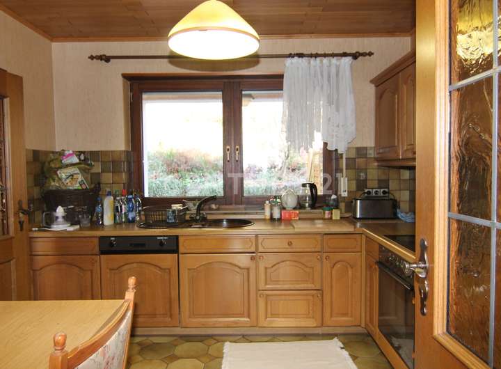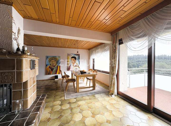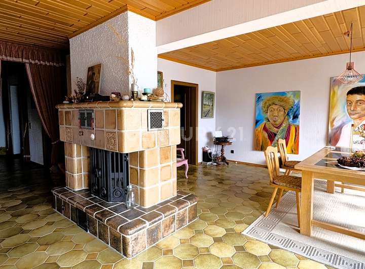 Ein gemütlicher Kachelofen im Wohnbereich sorgt zusätzlich zur Ölheizung für behagliche Wärme und eine besondere Wohnatmosphäre. Die Böden sind überwiegend mit pflegeleichten Fliesen ausgestattet und unterstreichen den praktischen Charakter des Hauses.