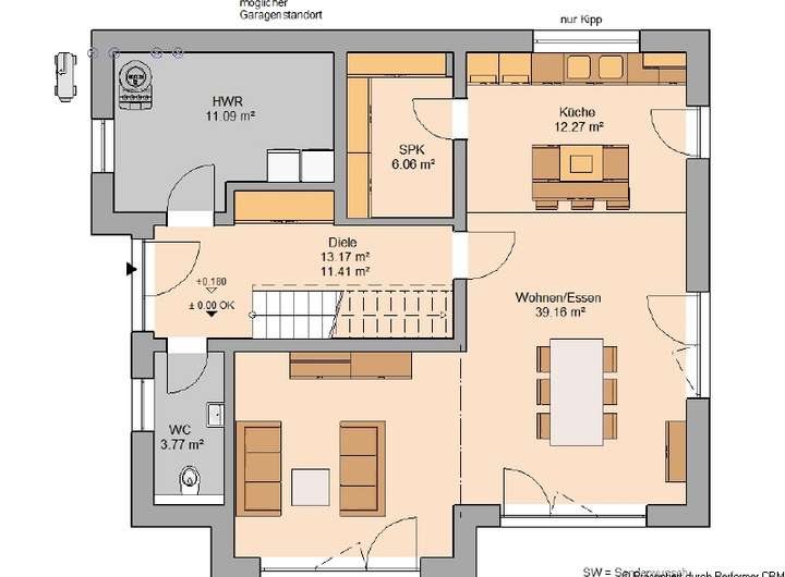 5 Zimmer, offene Küche, Diele, WC, Flur, Bad, Hauswirtschaftsraum, Speisekammer Das gezeigte Traumhaus im Überblick: + Schlüsselfertiges Massivhaus im Sinne der Ausstattungsbeschreibung "Edition 25" + Zukunftsorientierte Energieausstattung in Form einer Luft-Wasser-Wärmepumpe und Fußbodenheizung sowie einer kontrollierten Wohnraumlüftung mit Wärmerückgewinnung + Inklusive Bodenplatte Beste Markenausstattung in jedem Kern-Haus: + Zimmermannsmäßiger Dachstuhl aus Konstruktionsvollholz + Dacheindeckung mit Betondachsteinen von Braas + Hochwertiger Kunstharz-Außenputz für eine langlebige Fassade + Vollständige Badausstattung von Villeroy & Boch mit Badewanne und flacher Duschwanne sowie einer Echtglasduschkabine + Fliesen von Villeroy & Boch in Bad und WC + Haustür mit 5-fach-Sicherheitsverriegelung + Erstklassige Innentüren der Marke Herholz + Fenster mit 3-Scheiben-Wärmeschutzverglasung und Rollläden + Stahl-Holz-Treppe mit individueller Farbgestaltungsmöglichkeit + Vollständige und überdurchschnittliche Elektroausstattung inklusive Klingelanlage und Netzwerkdosen + Rauchmelder für Ihre Sicherheit + Alle Leistungen aus einer Hand + Alle Planungs- und Architektenleistungen + Einsatz regionaler Handwerksbetriebe + Baubegleitende 5-Phasen-TÜV-Prüfung und Blower-Door-Test + Individuelle Anpassung auf Ihre Bedürfnisse + Auf Wunsch mit Keller erhältlich + Auf Wunsch mit weiteren Energietechniken erhältlich