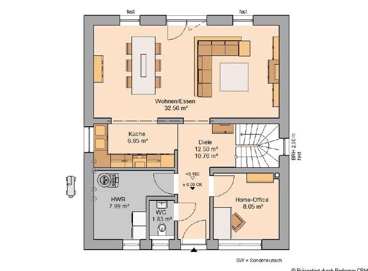 Erleben Sie das Gefühl zu Hause zu sein! Durch den Windfang betreten Sie das Haus und gelangen in den repräsentativen Flur. Das dahinterliegende, helle Wohn- und Esszimmer bietet viel Platz für einen großen Esstisch und eine gemütliches Sofa. Durch die bodentiefen Fenster hat man einen freien Blick in den Garten. In der offenen Küche macht das Kochen besonders viel Freude. Dieser familienfreundliche Bereich wird Ihnen ebenso zusagen wie der zusätzliche Wohnraum im Erdgeschoss. Gestalten Sie diesen ganz nach Belieben als Arbeits- oder Lesezimmer bzw. als Gästequartier. Über die attraktive Treppenkonstruktion gelangen Sie ins Dachgeschoss, in dem sich neben 3 Schlafräumen ein praktisch geschnittenes Familienbad befindet. Zur Gartenseite hin öffnet sich eine Panoramagaube, die einen herrlichen Ausblick ins Grüne ermöglicht. Dies ist der perfekte Ort zum Entspannen. Dieses Haus wird nach Ihren individuellen Wünschen geplant und ausgestattet!
