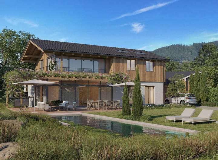 Das geplante Haus überzeugt durch eine edle Kombination aus Holzfassade und hellen Putzelementen – harmonisch eingebettet in die alpine Landschaft. 🌲