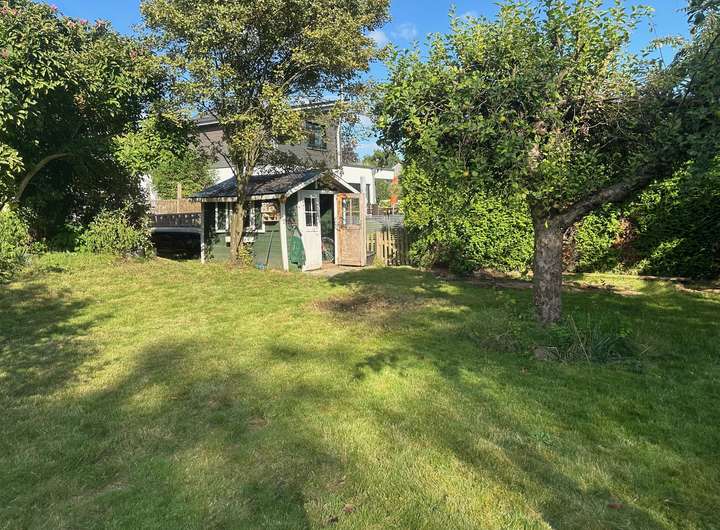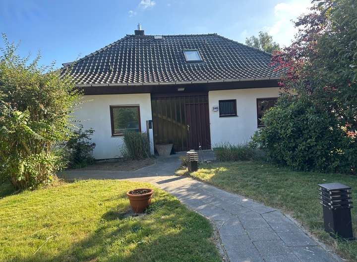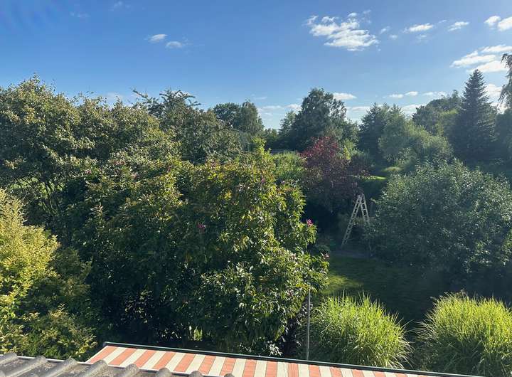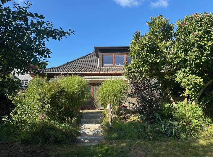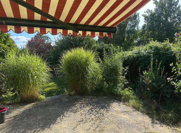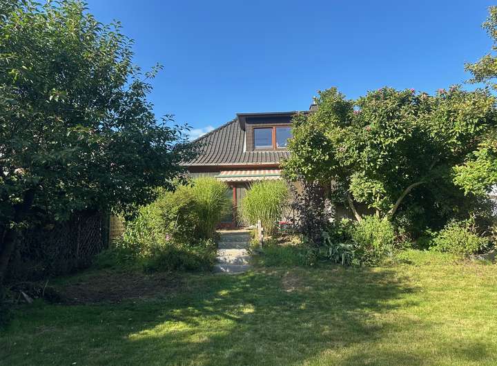 Vom Wohnzimmer gelangt man über die Terrasse mit Markise in den großzügigen Garten. Das eingewachsene Grundstück bietet einen schönen Bestand an Obstbäumen, Blütenhecken und Rasenfläche sowie ein kleines Gartenhäuschen. Entlang des Grundstücks verläuft ein kleiner Weg zum Naturschutzgebiet. Der vordere Teil des Grundstücks zur Straßenseite hin, verfügt ebenfalls über viele Sträucher und Bäume sowie eine gepflasterte Stellfläche für 4 PKW's und die beleuchtete Zuwegung zur Haustür.