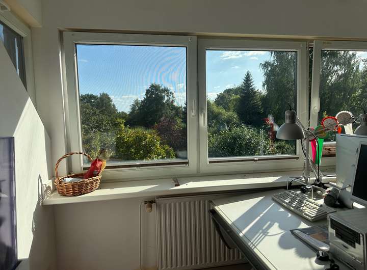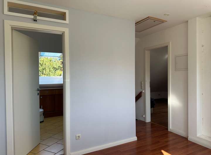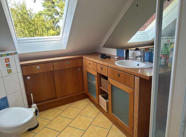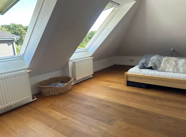 Das Dach wurde 2003 nachträglich gedämmt und mit 5 Velux-Fenstern und neuen Fenstern im Dachgeschoss in der Dachgaube versehen. Das Dachgeschoss bietet 2 Kinderzimmer, 1 Duschbad mit WC. Von der Gaube hat man einen wunderbaren Blick in den Garten und das Naturschutzgebiet. Alle Räume, bis auf das Badezimmer, sind mit Echtholz Parkett versehen. Das Objekt ist voll unterkellert. Im Keller befinden sich: Hauswirtschaftsraum, Hobbyraum, Werkraum mit Außentreppe, Arbeitsraum. Alle Räume sind beheizbar und haben je ein großes Fenster, welches viel Tageslicht in die Räume lässt.