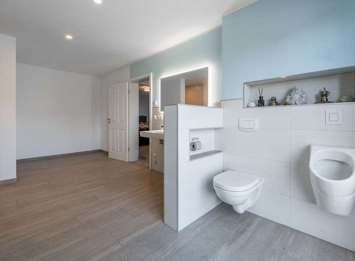 Die modernen Bäder verfügen über bodengleiche Duschen, geschmackvolle Armaturen und stilvolle Fliesen. Im großzügigen Hauptbad im Dachgeschoss erwarten Sie zudem eine Badewanne, Doppelwaschtisch, Toilette, Urinal und Anschlüsse für eine Sauna.