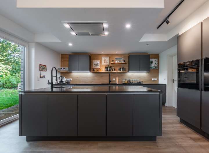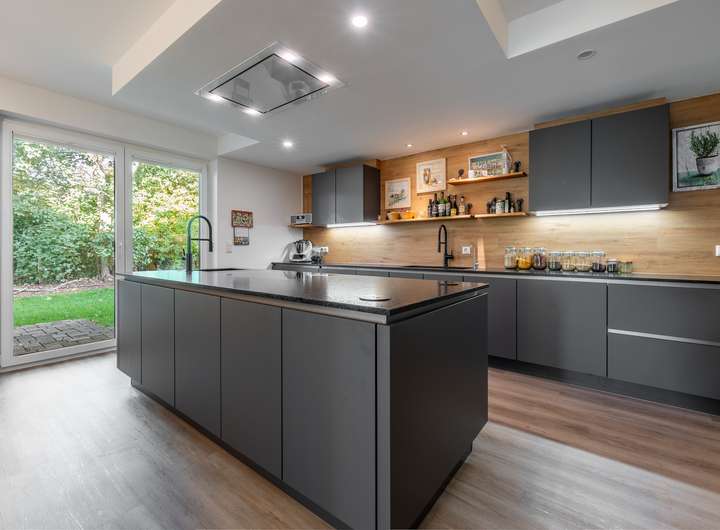 Die hochwertige Küche (nicht im Kaufpreis enthalten) überzeugt mit Kochinsel, integrierten Steckdosen, zwei Backöfen, Dampfgarer, zwei Spülbecken und direktem Gartenzugang – der perfekte Mittelpunkt des Hauses.