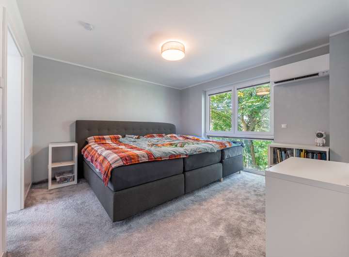 Im Inneren wurde viel Wert auf Qualität gelegt: In Schlaf- und Ankleidezimmern sorgt Teppichboden für Behaglichkeit, während in den übrigen Räumen Vinyl- und Fliesenböden Akzente setzen. Klimaanlagen in mehreren Räumen – darunter Küche, Wohnbereich, Arbeits- und Schlafzimmer – sowie eine kontrollierte Be- und Entlüftungsanlage sichern ein angenehmes Raumklima.
