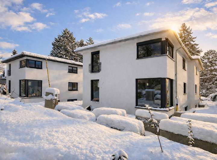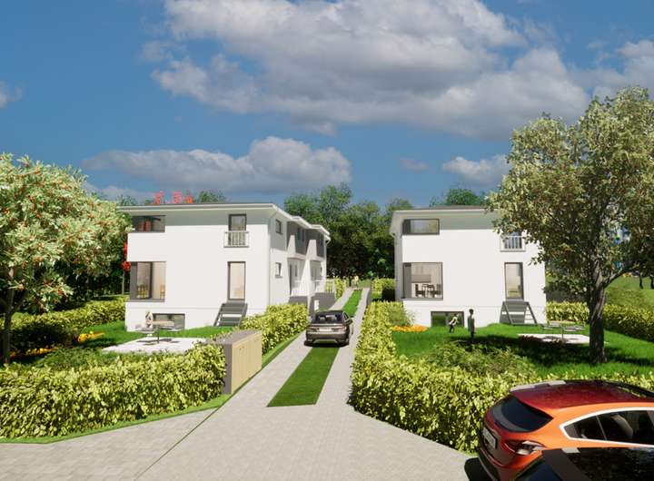 Auf einem sonnigen, ca. 1.619 m² großen Grundstück wird ein modernes, energieeffizientes Wohnensemble aus vier Doppelhaushälften errichtet. Die Häuser sind bereits im Bau, 75 % sind verkauft. Die vier Wohneinheiten werden voraussichtlich im April 2026 fertiggestellt. Das Ensemble besteht aus zwei Stadtvillen mit Wohnflächen von ca. 166 m² zzgl. ca. 20 m² Nutzfläche im Gartengeschoss.