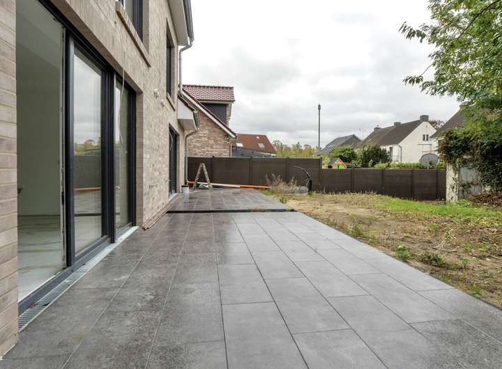 Ein grüner Garten mit Terrasse befindet sich hinter dem Objekt.