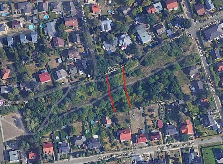 Das beigefügte Luftbild zeigt die ungefähre Lage des Grundstücks zwischen der Walter-Simon-Straße in Großziethen und der Landesgrenze Berlin–Brandenburg.