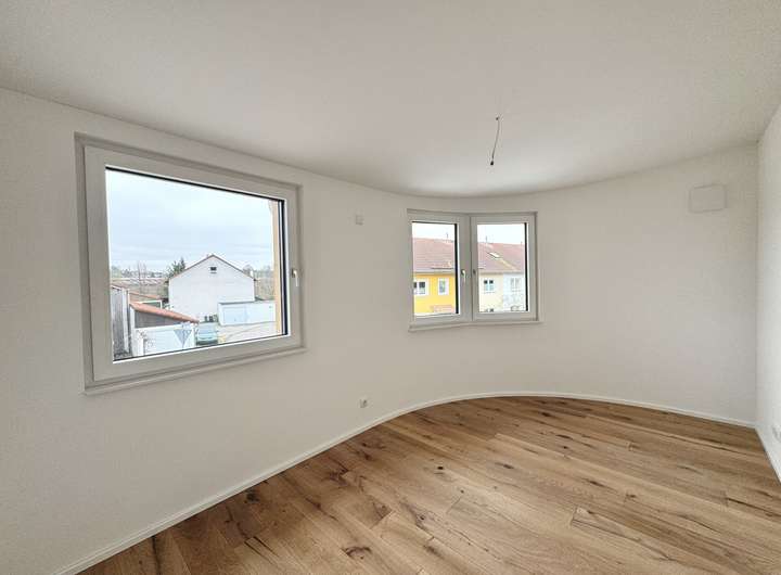 Ein weiterer Raum, der als Büro, Gäste- oder Kinderzimmer genutzt werden kann, zeichnet sich durch seine außergewöhnliche, abgerundete Form aus, die ihm eine besondere architektonische Eleganz verleiht. Die leicht geschwungene Außenwand mit mehreren Fenstern sorgt nicht nur für einen einzigartigen Charakter, sondern auch für eine angenehme Helligkeit im Raum.