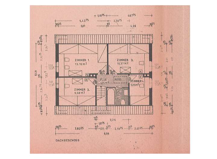 Der Grundriss überzeugt durch helle und großzügig geschnittene Räume. Im Erdgeschoss befinden sich das Wohnzimmer, die Küche, ein Schlafzimmer („Elternzimmer“), ein Wirtschaftsraum und ein Gäste-WC. Im Dachgeschoss sind vier weitere Zimmer sowie ein Badezimmer angeordnet.