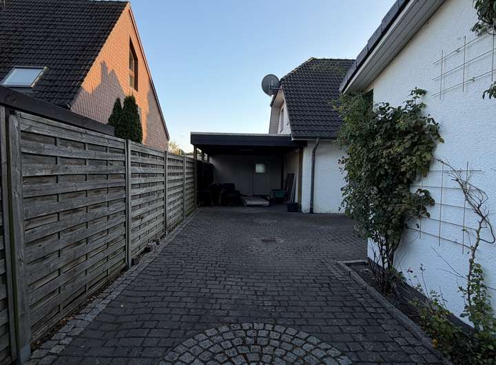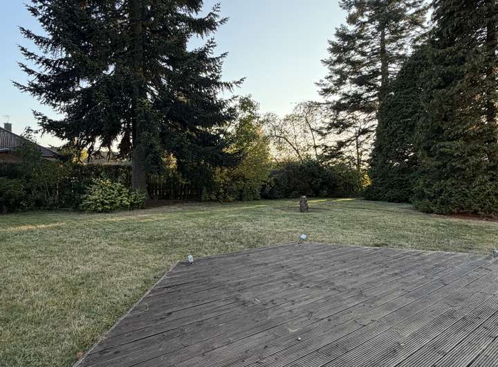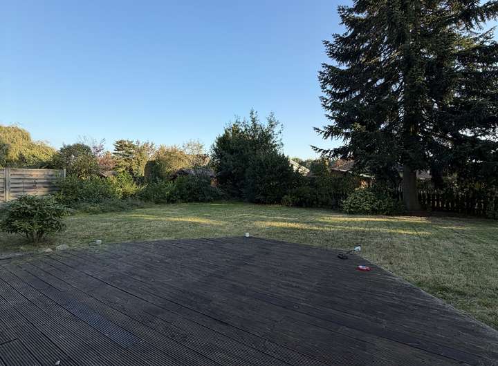 Der großzügige Garten mit großer Holzterrasse lädt zum Spielen und Entspannen ein. Ein Carport sowie ein Zugang zum Gartenschuppen sind ebenfalls vorhanden.