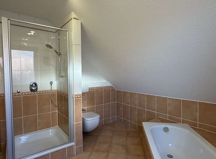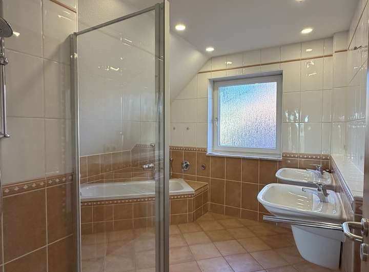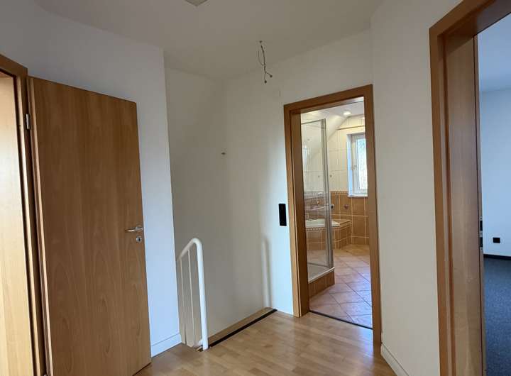 Im Obergeschoss befinden sich die Schlafräume, wovon zwei Zimmer Zugang zu einem gemeinsamen Balkon mit Blick in den gepflegten Garten bieten – ideal für entspannte Stunden im Freien. Während im Erdgeschoss hochwertiges Parkett für ein stilvolles Wohngefühl sorgt, schaffen die Teppichböden im Obergeschoss ein angenehmes, wohnliches Ambiente. Die Beheizung erfolgt über eine Wärmepumpe.