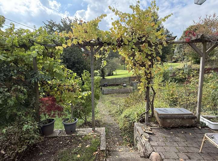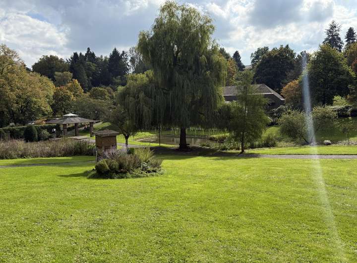 - Die Außenanlage befindet sich hinter dem Wohnhaus und ist vom Flur im Erdgeschoss aus zu erreichen. Hier befinden sich eine Terrasse, ein Holzlagerschuppen und eine Grünfläche, die direkt an den Kurpark angrenzt.
