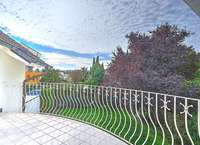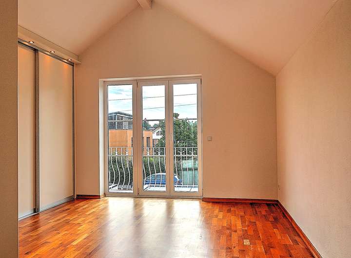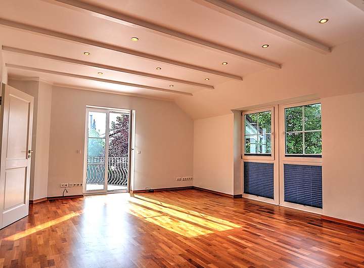 Im Obergeschoss erwarten Sie ein lichtdurchflutetes, großräumiges Zimmer mit offenem Sichtdachstuhl, abgehängter Decke und stilvollen Halogenspots. Von hier aus haben Sie Zugang zu einem Balkon mit herrlichem Ausblick. Zusätzlich gibt es ein weiteres Zimmer mit praktischem Einbauschrank und einem kleinen Balkon. Das helle Badezimmer verfügt über Badewanne, Bidet, separate Dusche und Fenster und sorgt für komfortables Wohnen.