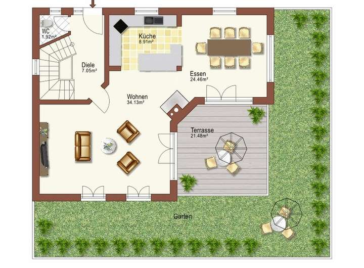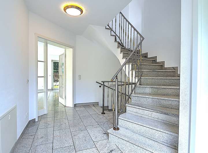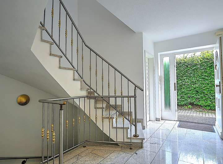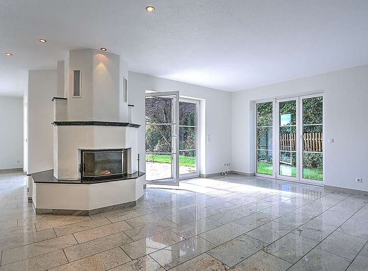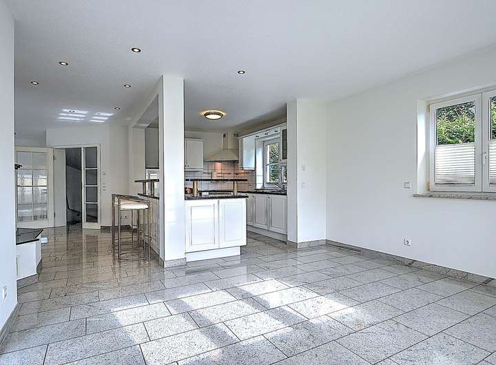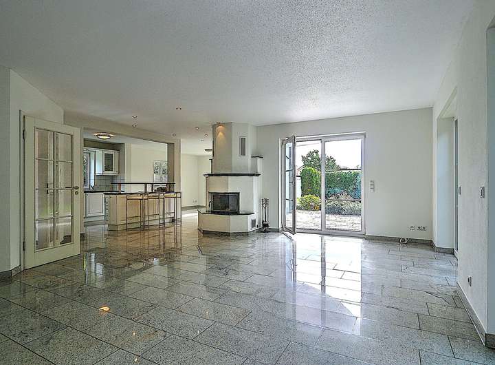 Das Haus präsentiert sich mit hochwertigen Granitböden und Fußbodenheizung im gesamten Gebäude. Mittelpunkt des Erdgeschosses ist der großzügige Wohn- und Essbereich mit offener Küche samt Theke und einem gemütlichen Kamin. Von hier aus gelangen Sie direkt auf die großzügige, nach Südosten ausgerichtete Sonnenterrasse mit Blick in den gepflegten Garten. Ein Gäste-WC ergänzt das Raumangebot auf dieser Ebene.