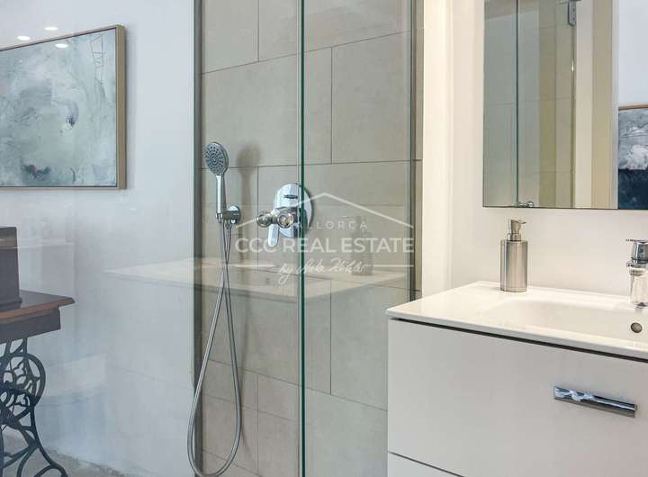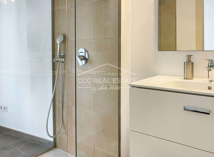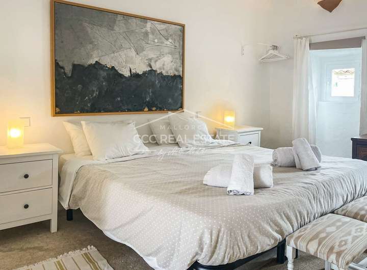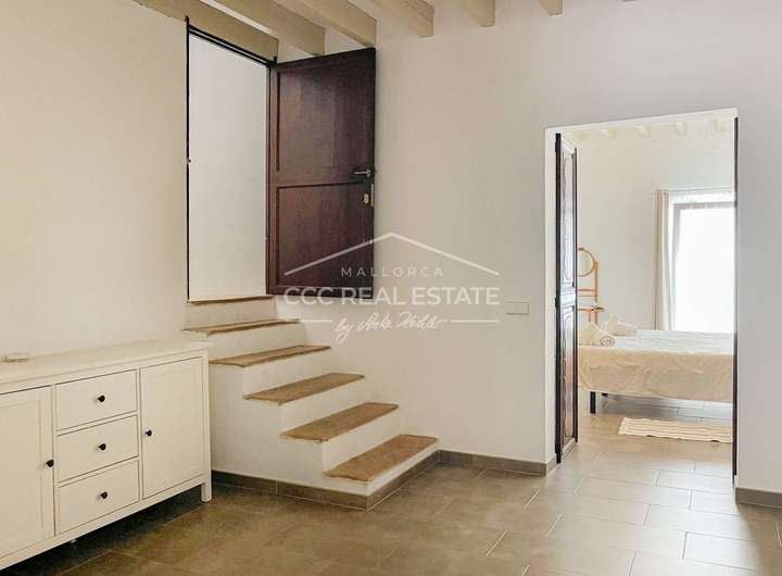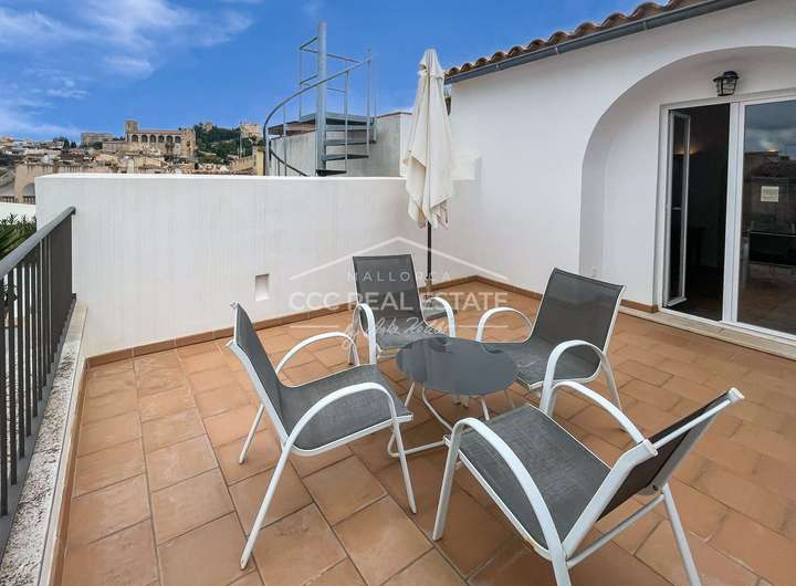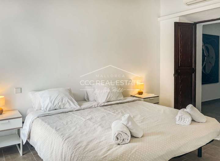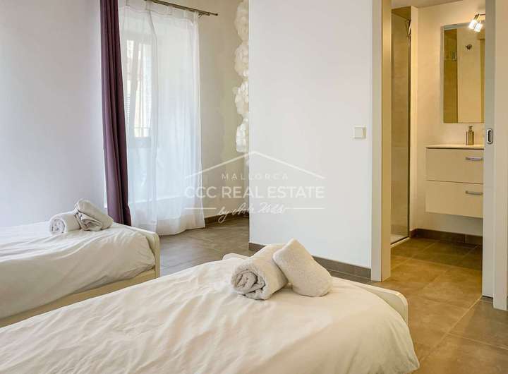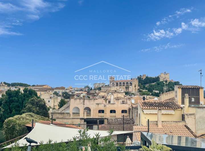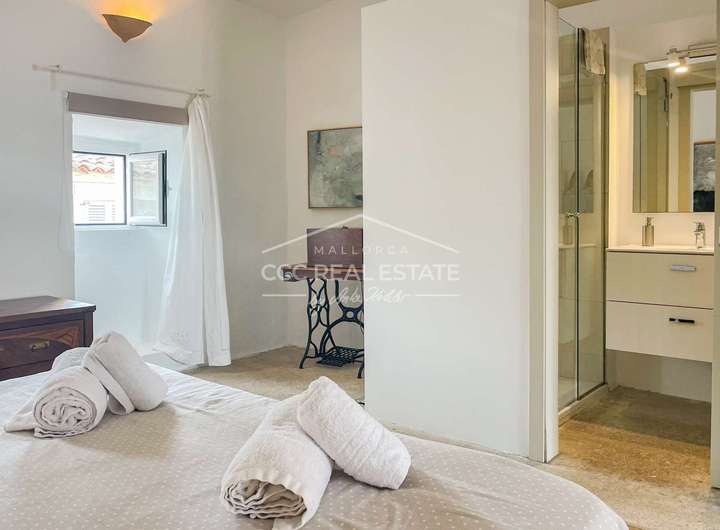 Im ersten Obergeschoss befinden sich zwei Doppelschlafzimmer, jeweils mit eigenem Bad en Suite. Das zweite Obergeschoss bietet ein weiteres Schlafzimmer, ebenfalls mit Bad en Suite, sowie einen zusätzlichen Wohnbereich. Von dort aus gelangen Sie auf die private Dachterrasse mit Blick auf den Klosterberg Sant Salvador.