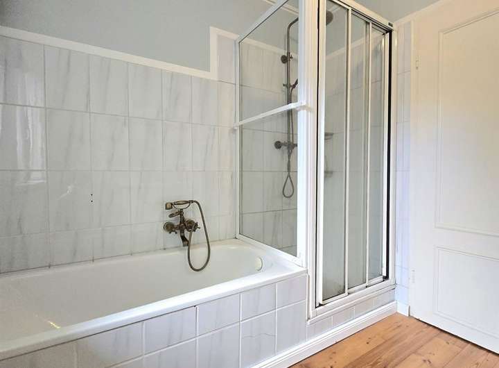 - Badezimmer mit Badewanne, Dusche, Waschtisch mit breitem Unterschrank, WC und Fenster
