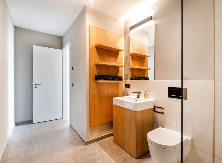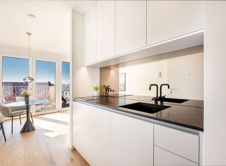 Ein intelligent geschnittener Wohn-/Schlafbereich mit räumlich versetzter Küchenzeile, ein Duschbad und ein sonniger Balkon bilden das Raumangebot. Geöltes Eichen-Dielenparkett, eine weiße Schreiner-Einbauküche mit Naturstein-Arbeitsfläche und Markengeräten, bodentiefe Fenster und stylisch-puristisches Baddesign mit Holzeinbauten und Objekten von Duravit und Keuco schaffen ein äußerst attraktives Ambiente. Zur Wohnung gehören ein Kellerabteil und ein Tiefgaragen-Einzelstellplatz. Es besteht schwellenfreier Wohnungszugang.