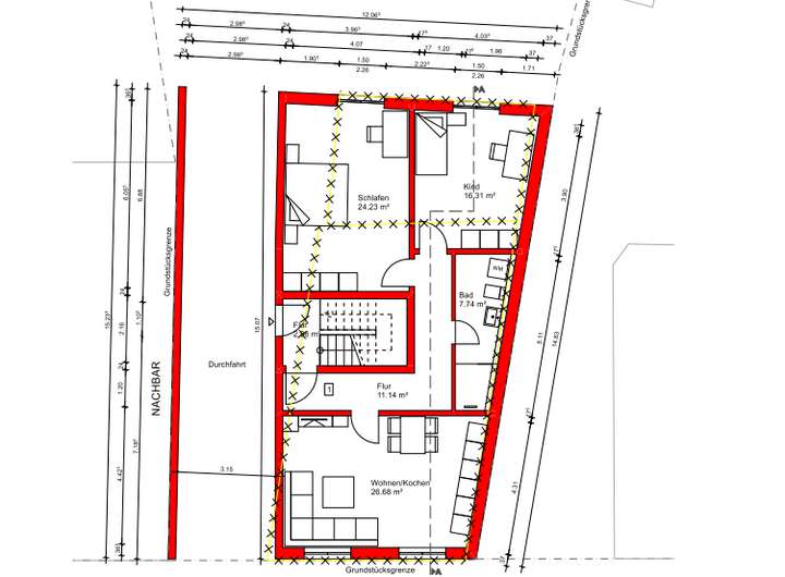 Nach aktuellem Planungsstand ist die Bebauung mit einem Mehrfamilienhaus mit bis zu ca. 505 m² Wohnfläche und insgesamt bis zu 7 Wohneinheiten denkbar. Die Grundflächenzahl (GRZ) beträgt 0,6, die Geschossflächenzahl (GFZ) liegt bei 1,60. Eine Bebauung nach Art der beigefügten Visualisierungen laut Architekten realistisch – die endgültige Planung und Umsetzung bedarf jedoch der Abstimmung mit dem zuständigen Bauamt.