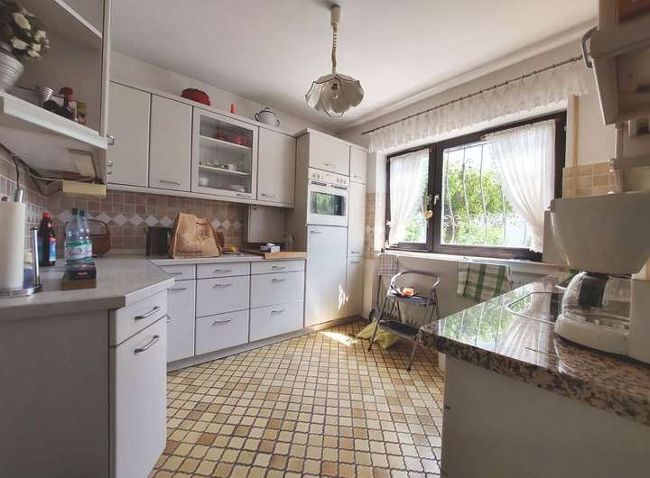 Zentrum des Hauses ist ein über 32m² großer L-förmiger Wohn- und Essbereich mit Terrassen- und Gartenzugang. Die etwas über 9m² große Küche hat wahlweise direkten Zugang zum Wohn- und Essbereich, ist aber auch über den Flur zu erreichen.