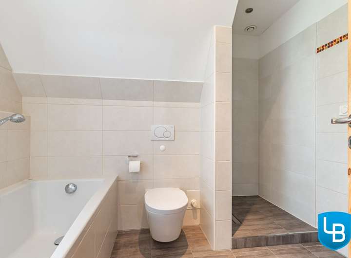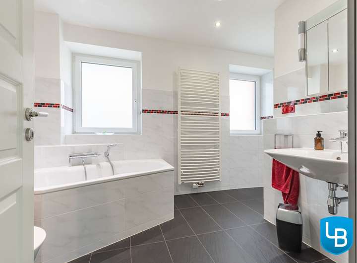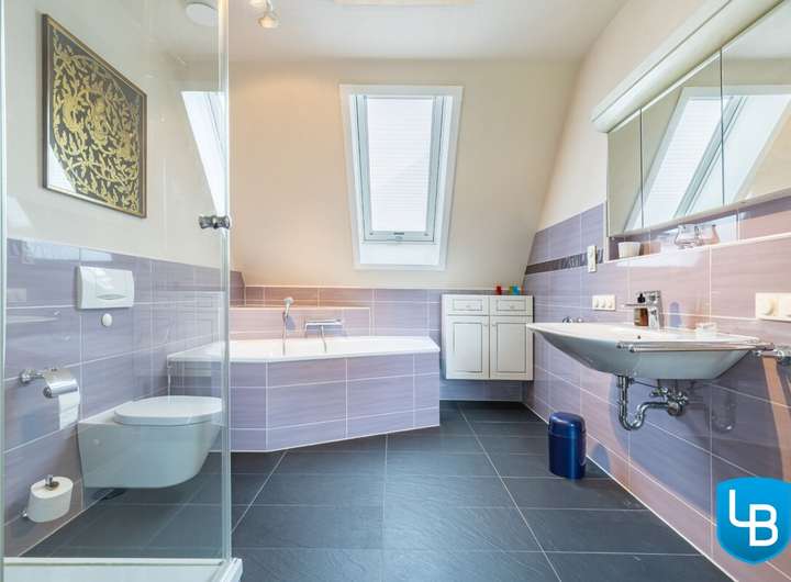 + Modernes Vollbad mit Eckbadewanne, Fenstern und Zugang zum Dachboden