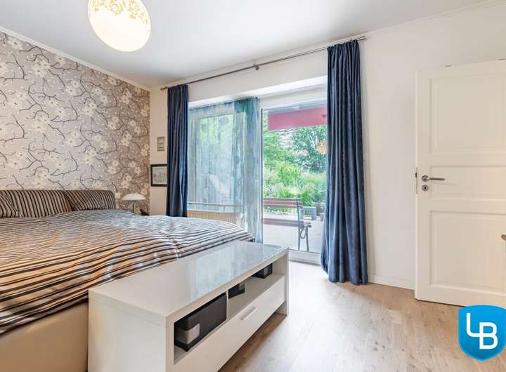 + Schlafzimmer mit Zugang auf die Terrasse und Blick auf den Teich im Garten