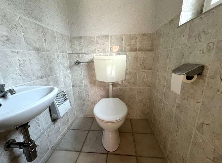 Es ist mit einer Toilette und einem Waschtisch ausgestattet und ist hell gefliest.