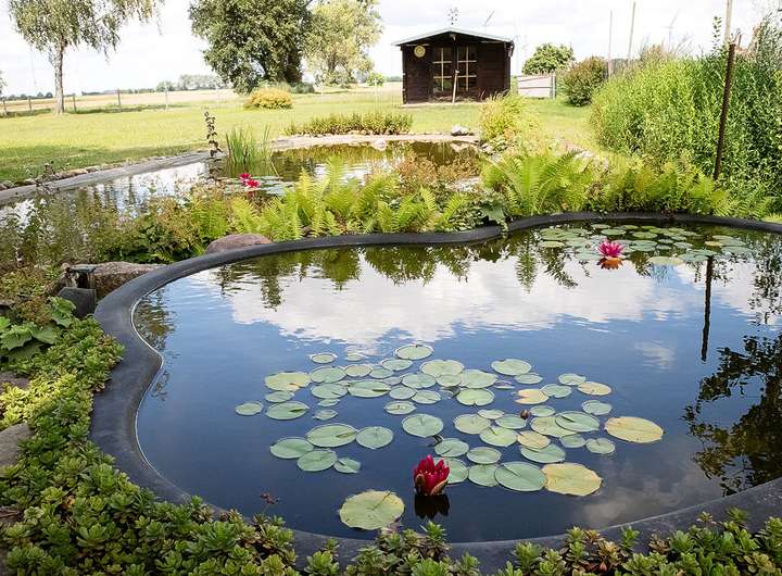 - gepflasterter Hof, Garten mit Teich, Terrasse und Gartenhaus mit Strom