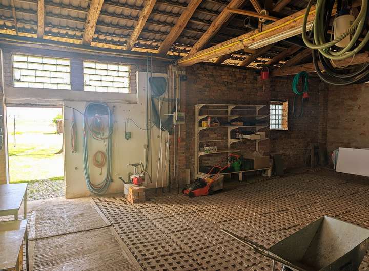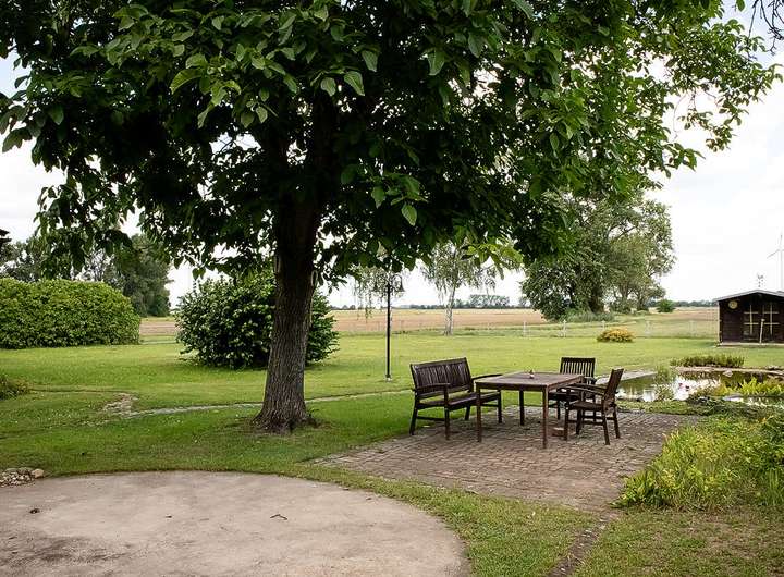 Das große Grundstück bietet einen weitläufigen Garten mit einer Terrasse, einen kleinen Teich, ein Gartenhaus und gepflegte Grünflächen. Weitere Nebengelasse, eine Garage mit elektrischem Tor, ein ehemaliges Büro mit zwei Räumen und ausgebauten Obergeschoss für Stauraum, eine kleine Werkstatt und einer großen Scheune mit Gartenzugang runden das Angebot ab.