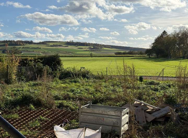Südwestterrasse mit großem Garten und Blick ins Feld – sonnig bis in den Abend.