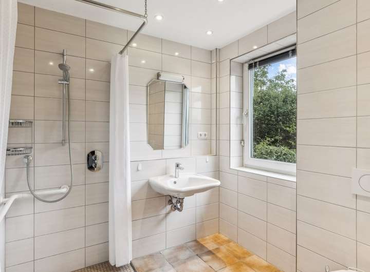 Das Erdgeschoss besticht durch einen lichtdurchfluteten, großzügigen Wohnbereich, der eine einladende Atmosphäre schafft. Direkt angrenzend finden Sie eine halboffene, moderne Küche, die durch ihre funktionale Gestaltung und Ausstattung zu überzeugen weiß. Ein barrierefreies, modernisiertes Duschbad aus ca. dem Jahr 2014 vervollständigt das Erdgeschoss und sorgt für zusätzlichen Komfort. Der Bodenbelag im Wohnzimmer im Erdgeschoss wurde ca. 2022 erneuert, was den Räumen eine helle und moderne Atmosphäre verleiht.