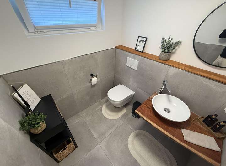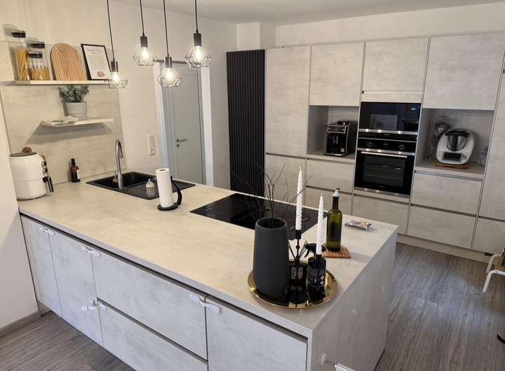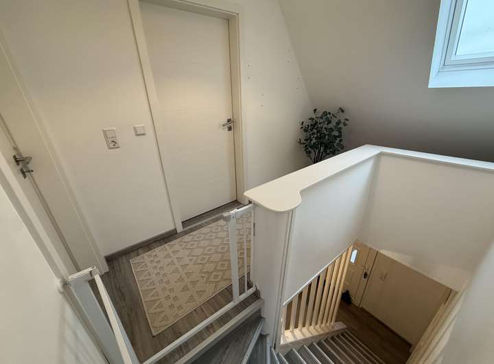 Im Erdgeschoss erwartet Sie ein großzügiger Wohn‑/Essbereich mit angrenzender Küche. Die offene Küche mit Kochinsel ist im Kaufpreis enthalten und bildet den Treffpunkt für die ganze Familie. Ein Gäste‑WC mit bodengleicher Dusche und ein praktischer Hauswirtschaftsraum komplettieren das Raumangebot auf dieser Ebene. Die Fußbodenheizung sorgt hier für angenehme Wärme, im Obergeschoss wurden neue Heizkörper installiert.