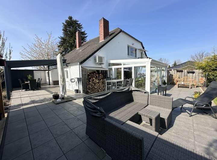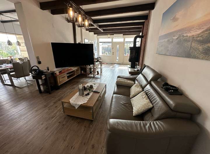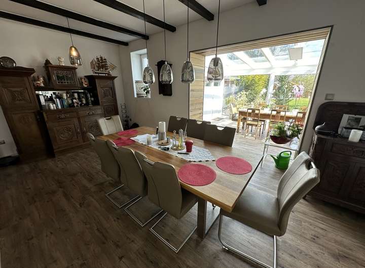 Die Hauptwohnung überzeugt mit einem großzügigen, offen gestalteten Wohn- und Essbereich, der direkt in den modernen Wintergarten (Baujahr 2020) übergeht. Große Fensterflächen holen den Garten ins Haus und schaffen eine helle, freundliche Atmosphäre.