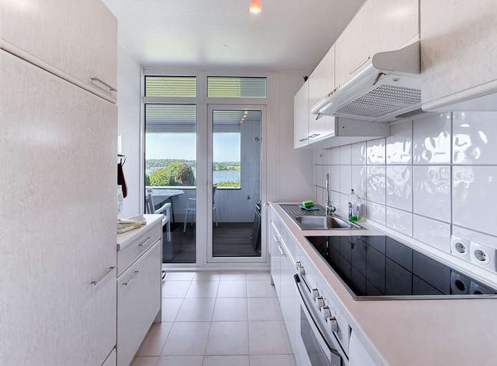 •Küche mit moderner Einbauküche und Blick auf die Schlei und Zugang zur Loggia