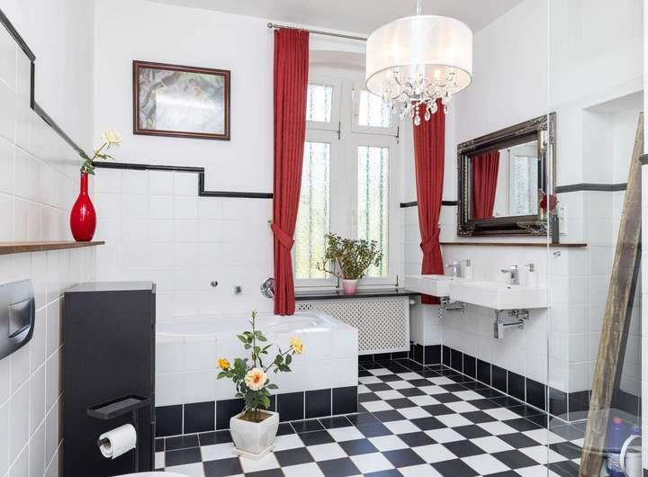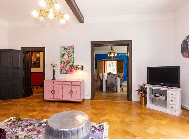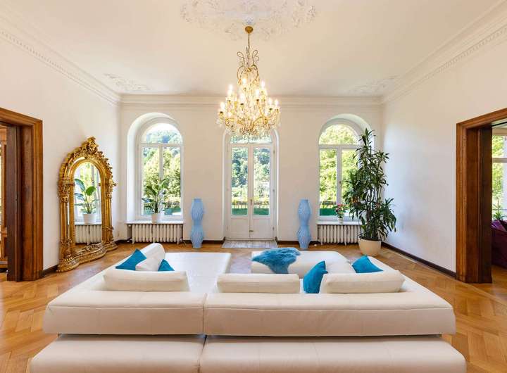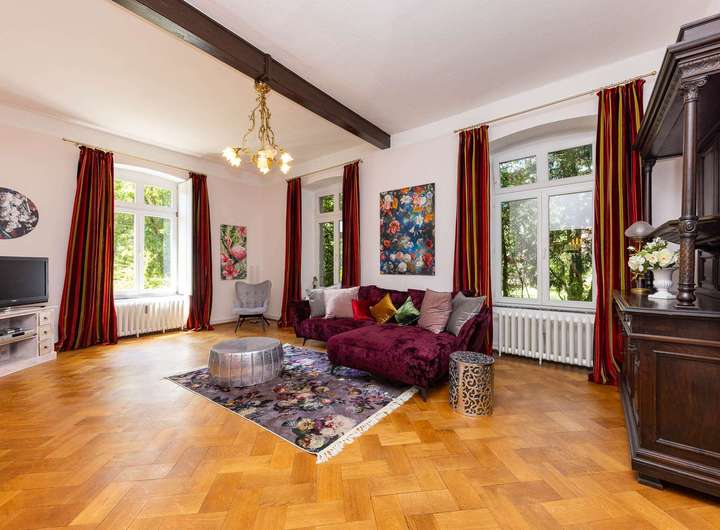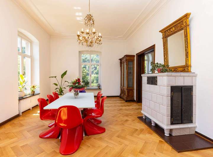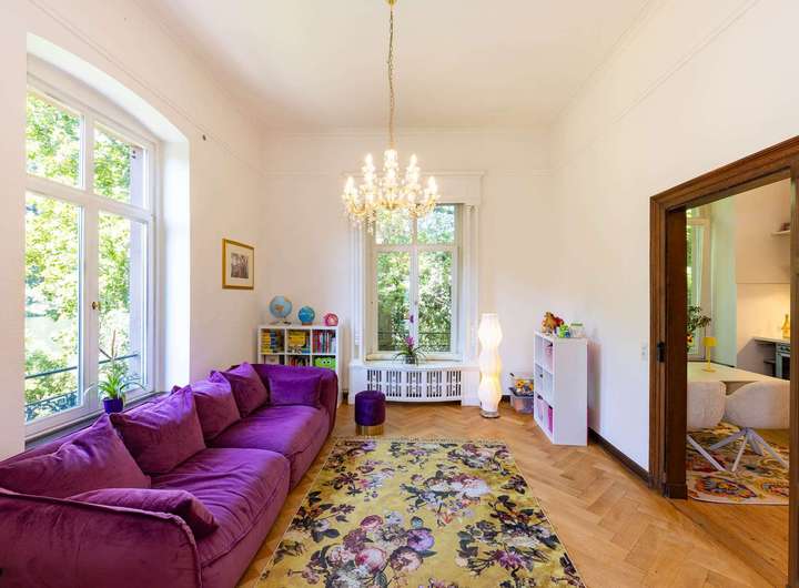 • 11 Zimmer mit ca. 3,8m Deckenhöhe, teilweise mit echtem Stuck, Parkett oder Holzdielenböden