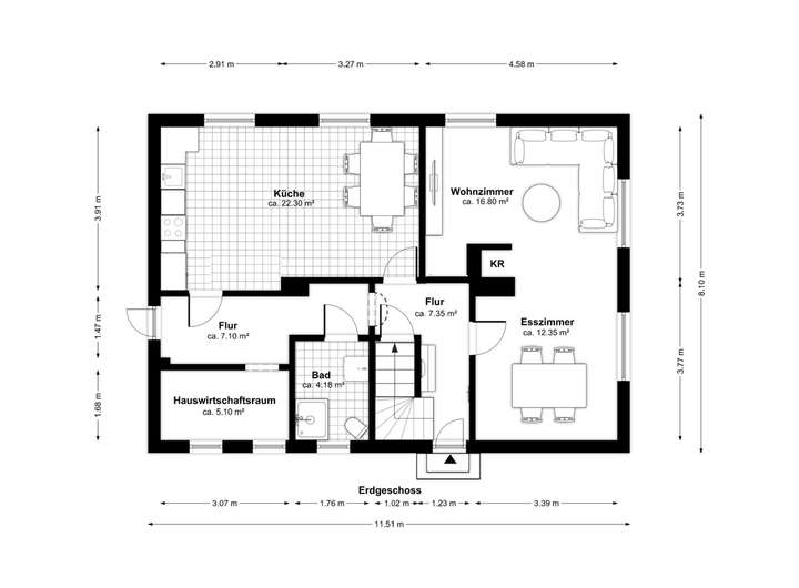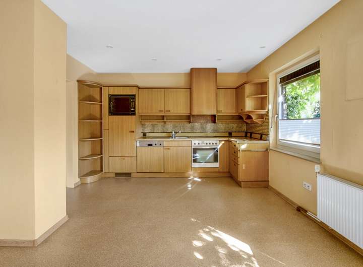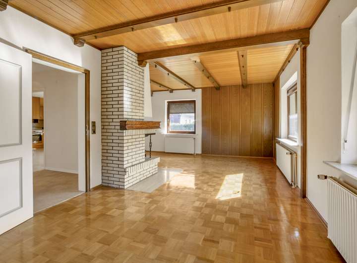 Das im Jahr 1964 errichtete Einfamilienhaus bietet eine Wohnfläche von ca. 120m² und steht auf einem Grundstück von insgesamt 552m² . Über den Eingangsbereich gelangt man in den geräumigen Flur des Hauses, von dem aus alle Räume des Erdgeschosses erreichbar sind. Auf der rechten Seite befindet sich das großzügige Wohn- und Esszimmer, das durch seine Größe vielfältige Gestaltungsmöglichkeiten bietet und über einen offenen Kamin verfügt, der eine gemütliche Atmosphäre schafft. Entlang des Flures gelangt man zur geräumigen Küche mit ausreichend Platz für einen Esstisch. Zusätzlich befinden sich im Erdgeschoss ein Duschbad sowie ein Hauswirtschaftsraum. Ein Zugang im hinteren Teil des Hauses führt direkt in den Garten.