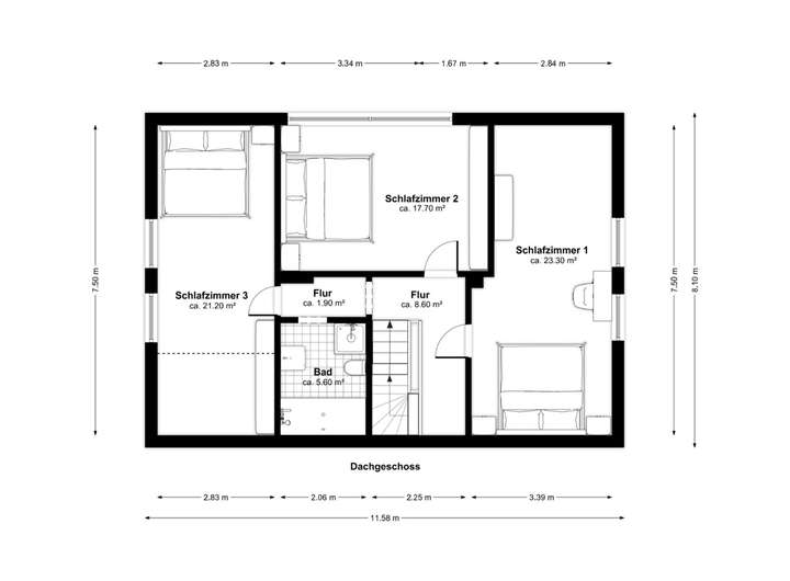 Im Obergeschoss stehen drei Schlafräume sowie ein Vollbad mit Fenster zur Verfügung. Der Dachboden bietet zusätzlichen Stauraum und rundet das Platzangebot ideal ab.