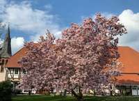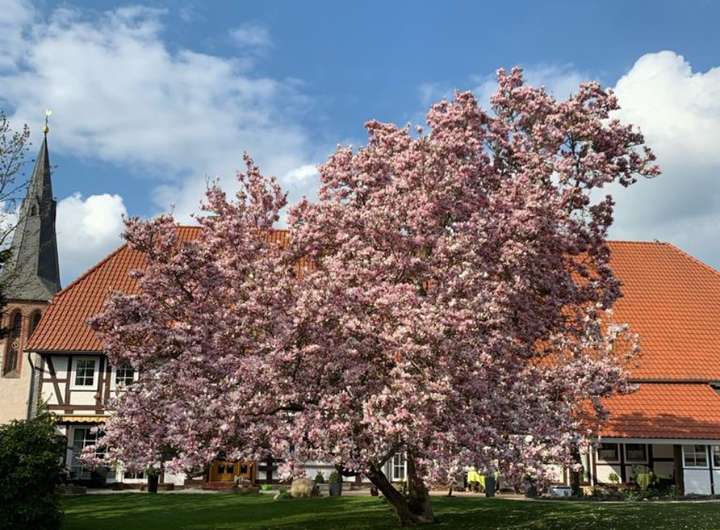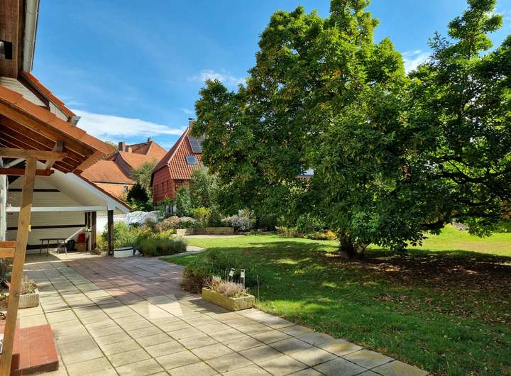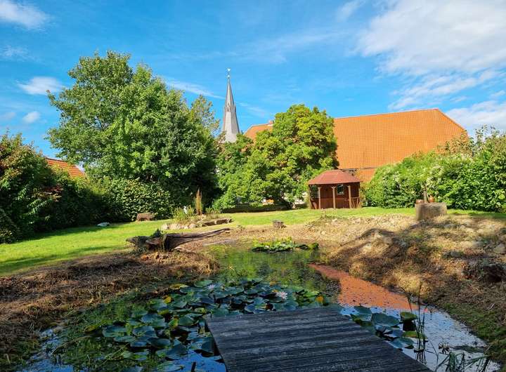 Ein wunderschön angelegter, großer Teich verleiht dem Garten eine ganz besondere Atmosphäre und lädt zum Verweilen ein. Eine prachtvolle, alte Magnolie setzt im Frühling mit ihrer Blütenfülle eindrucksvolle Akzente.