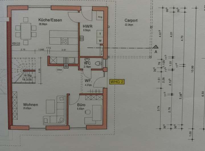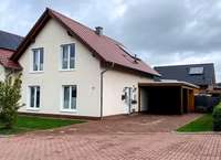 Diese 2016 erbaute Doppelhaushälfte bietet ca. 146 m² Wohnfläche auf zwei Ebenen und steht auf einem ca. 420 m² großen Grundstück. Der Grundriss ist funktional, die Räume sind hell und gut nutzbar. Eine Terrasse, ein Carport und ein separates Gerätehaus ergänzen das Angebot. •Baujahr 2016 •Grundstück: ca. 420 m² •Wohnfläche: ca. 146 m² •6 Zimmer, 1 Bad, 1 Gäste-WC •Süd-Dach mit Warmwasserkollektoren •Gastherme und zusätzlicher Ofen im Wohnbereich •Terrasse ca. 9 × 4 m •Carport ca. 22 m² •Gerätehaus ca. 12 m² Raumaufteilung Erdgeschoss (ca. 78,4 m²) •Wohnbereich: ca. 25,7 m² •Küche/Essen: ca. 29,0 m² •Büro: ca. 8,7 m² •HWR: ca. 8,6 m² (Zugang zum Carport) •Gäste-WC Dachgeschoss (ca. 68,4 m²) •Elternschlafzimmer: ca. 15,9 m² •2 Kinderzimmer: ca. 12,5 m² und ca. 11,7 m² •Bad mit Dusche und Badewanne: ca. 14,7 m² •Büro: ca. 6,1 m²