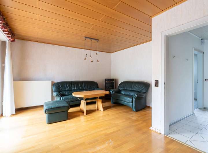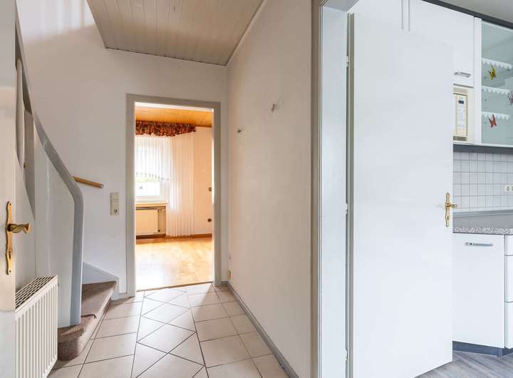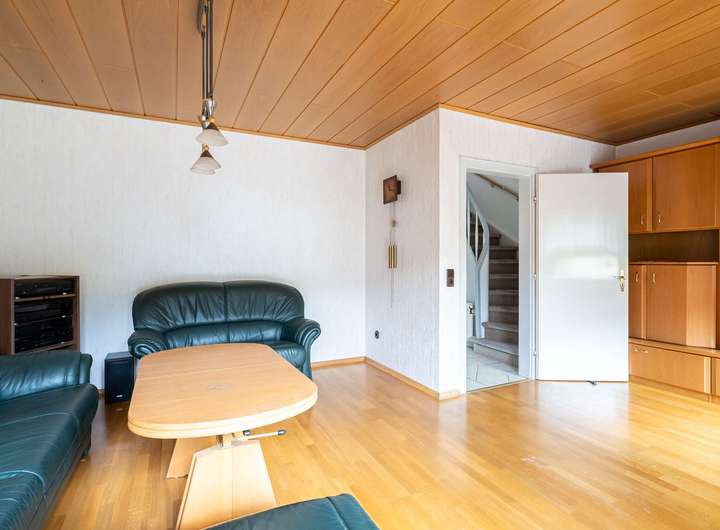 Im Erdgeschoss befindet sich das gemütliche Wohnzimmer, das durch große Fensterflächen hell und freundlich wirkt und zudem direkten Zugang zur sonnigen Terrasse bietet. Die Küche ist separat gehalten und bietet ausreichend Platz für eine Einbauküche mit Essbereich. Ergänzt wird das Erdgeschoss durch ein Gäste-WC, das den Alltag komfortabel abrundet.