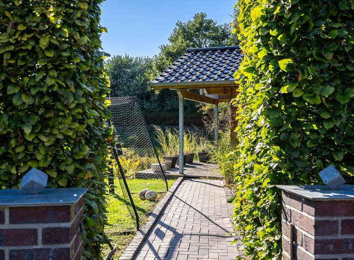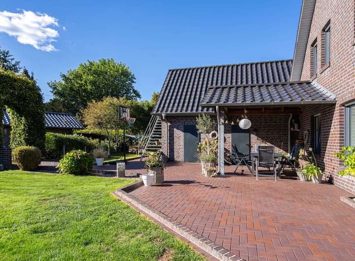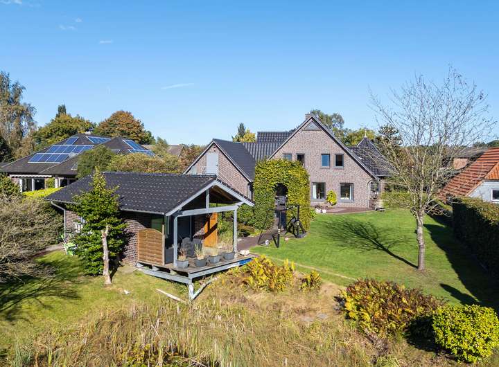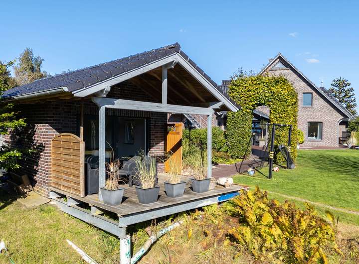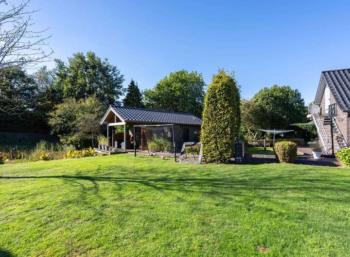 Der liebevoll gestaltete Garten ist nach Südwesten ausgerichtet, vollständig eingefriedet und somit ideal für Familien mit Kindern oder Haustieren. Ein idyllischer Teich sowie ein Gartenhaus mit angrenzendem Schuppen unterstreichen den hohen Freizeitwert des Außenbereichs. Die große Terrasse bietet viel Platz für Gartenmöbel, Grill und Sonnenliegen – perfekt für warme Sommertage und laue Abende im Freien.