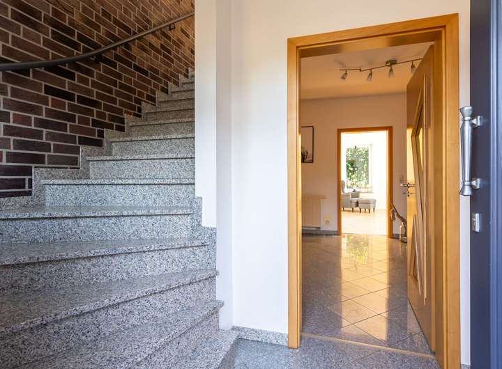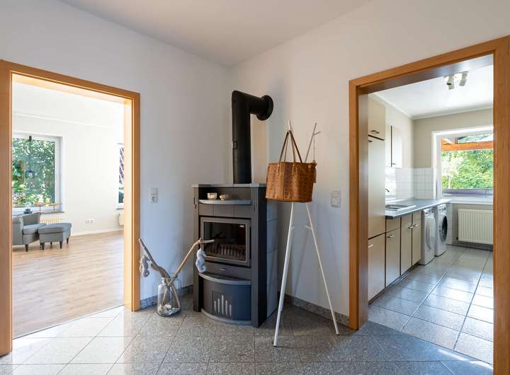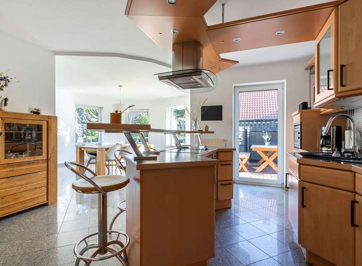Das Erdgeschoss überzeugt durch seine durchdachte Raumaufteilung und eine helle, offene Atmosphäre. Herzstück ist die offene Küche mit angrenzendem Essbereich im Erker, von dem aus Sie direkten Zugang auf die großzügige Terrasse haben – ideal für gesellige Stunden im Freien. Ein separates Wohnzimmer lädt zum Entspannen ein, während ein zusätzliches Büro Raum für konzentriertes Arbeiten oder individuelle Nutzung bietet. Ein besonderes Highlight ist der gemütliche Kamin im Flur, der in der kühleren Jahreszeit für wohlige Wärme im gesamten Haus sorgt. Zwei Gäste-WCs im Erdgeschoss runden das Platzangebot sinnvoll ab.
