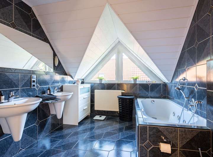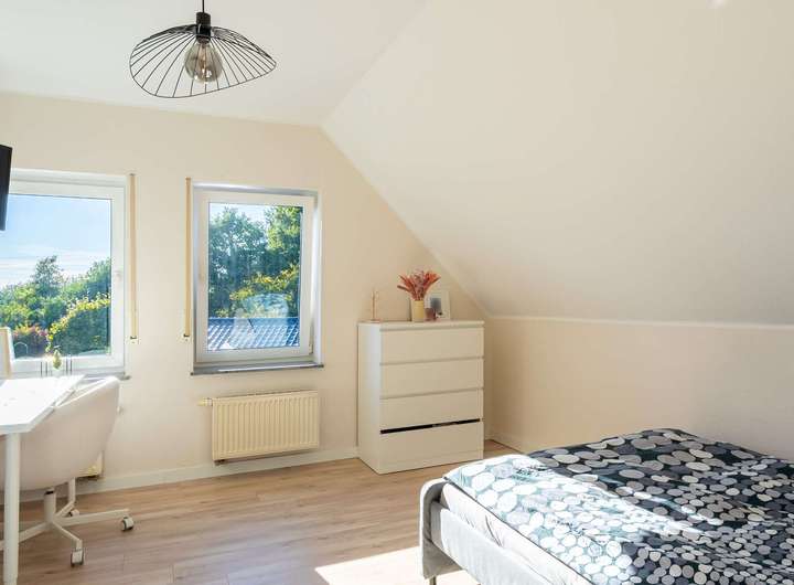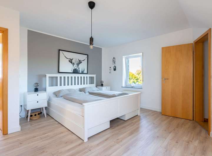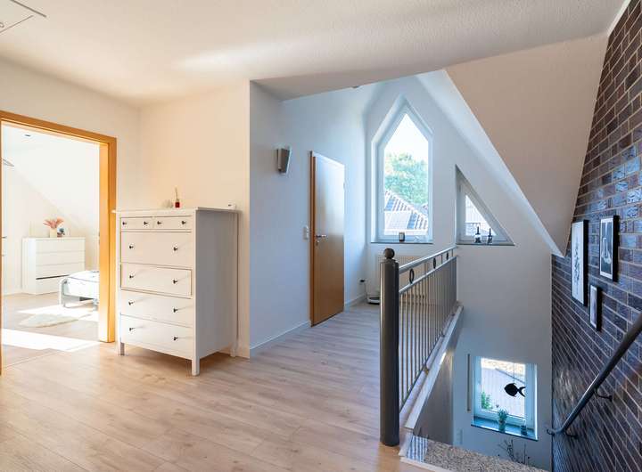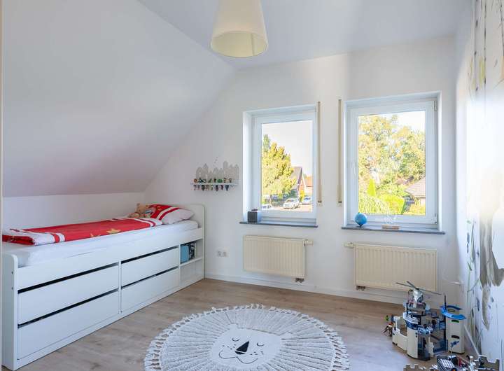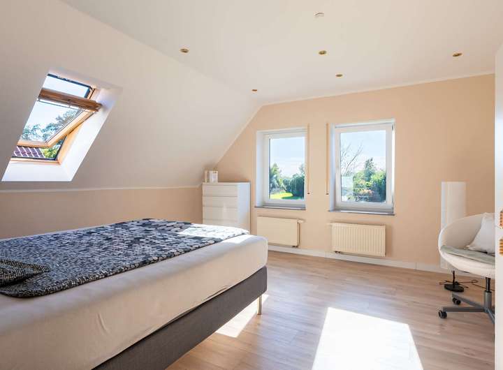 Im Obergeschoss befinden sich insgesamt vier Schlafräume, die vielfältige Nutzungsmöglichkeiten bieten – ob als Kinder-, Gäste- oder Hobbyzimmer. Das Elternschlafzimmer ist mit einem praktischen Ankleidezimmer verbunden. Das moderne Badezimmer verfügt über eine Dusche sowie eine Badewanne und bietet damit alles für einen entspannten Start in den Tag.