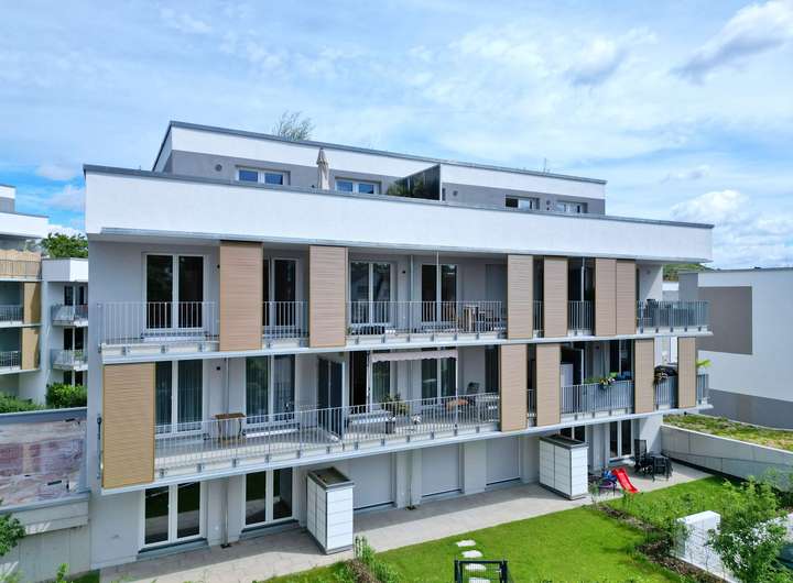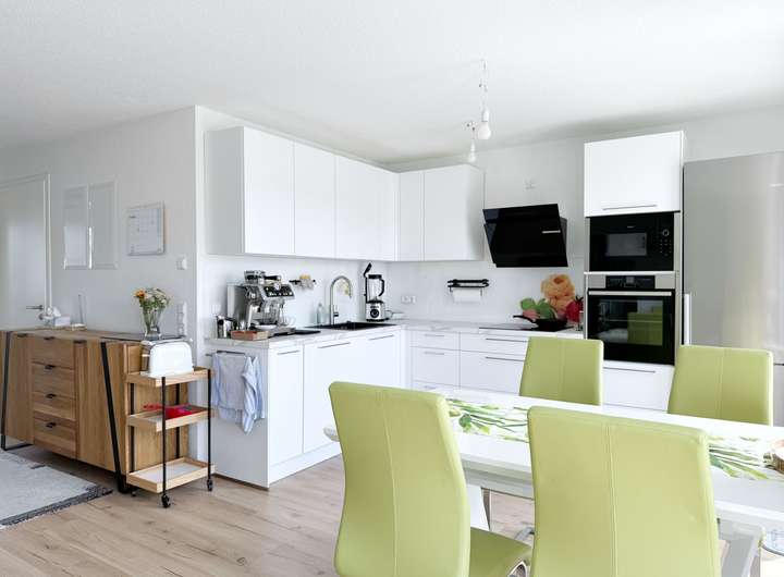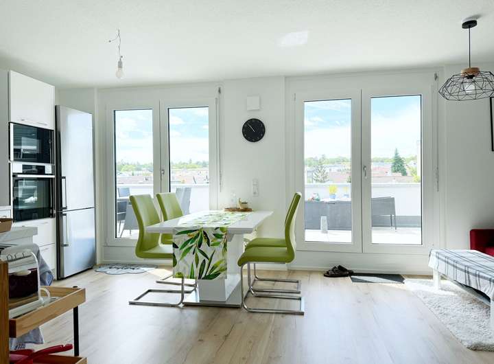 Genießen Sie sonnige Stunden auf der nach Süden orientierten Dachterrasse, die mit einer Fläche von über 50 m² ausreichend Platz für gemütliche Stunden im Freien bietet. Der offene und helle Wohn- und Essbereich lädt zum Verweilen ein und schafft eine einladende Atmosphäre für gesellige Zusammenkünfte mit Familie und Freunden.