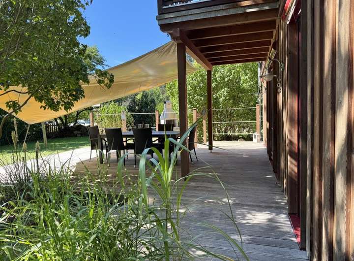 Natürlich gebautes Haus mit Luftwärmepumpe und Holzschuppen
