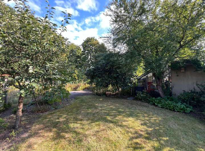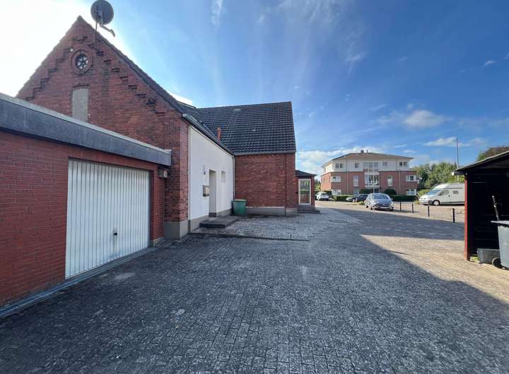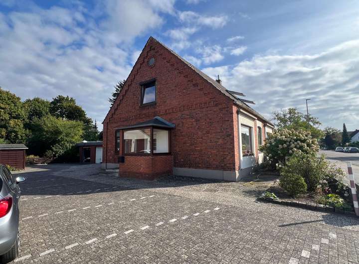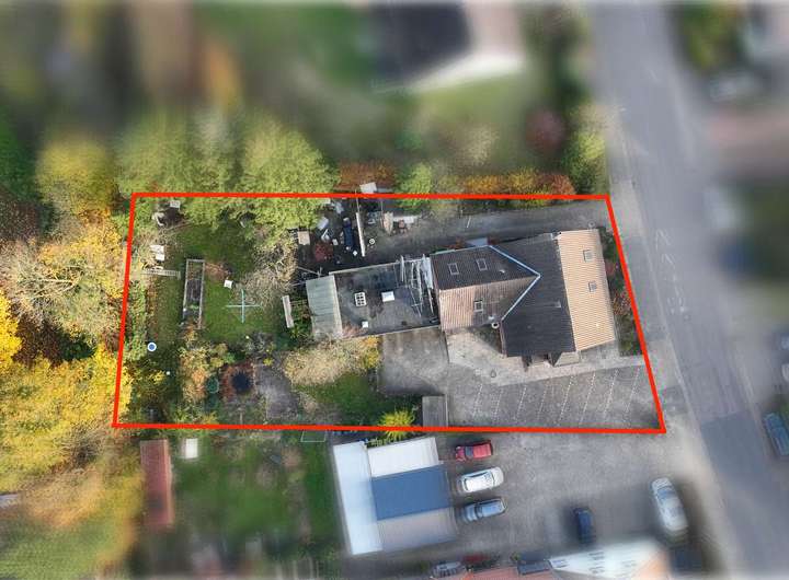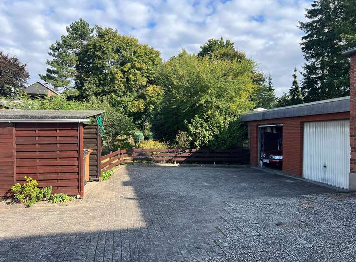 Vor dem Objekt befindet sich ein gepflegter Vorgarten. An beiden Seiten des Hauses stehen Zufahrten mit jeweils bis zu fünf Stellplätzen zur Verfügung. Zudem befinden sich zwei Garagen auf dem Grundstück. Hinter dem Gebäude erstreckt sich ein großzügiger Garten mit weitläufiger Grünfläche sowie einer einladenden Terrasse und einem Gewächshaus.