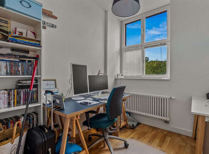 Beim Betreten der Wohnung gelangen Sie zunächst in den Flur. Zur linken Seite liegt ein kleineres Zimmer, das sich ideal als Arbeits- oder Gästezimmer eignet. Daran anschließend befindet sich das freundlich geflieste Badezimmer mit Fenster, Badewanne samt Duschabtrennung sowie einem praktischen Waschmaschinenanschluss. Nebenan liegt das geräumige Schlafzimmer in Nordausrichtung, das sich als ruhiger Rückzugsort anbietet.